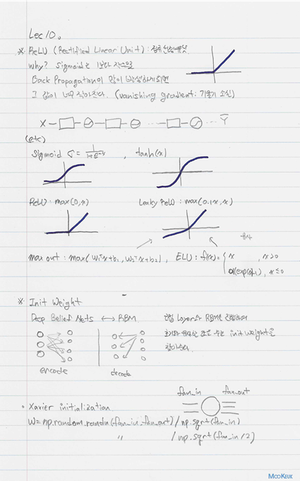 해당 Lec은 NN 을 구성함에 있어서 주의할 점과 유용하게 사용되는 것들에 대해 알아 볼 수 있는 강의였다. 여러가지 함수와 모델링 방법들을 볼 수 있었고, 이것들이 좀 더 와닿으려면 직접 데이터를 가지고 학습하고 테스트해보고 정확도를 측정해보는 것이 좋을 것 같다. 우선은 이론에 대해 익히고 시험을 목표로 학습이니 시험을 기준으로 이론에 대해 숙지하도록 하자.